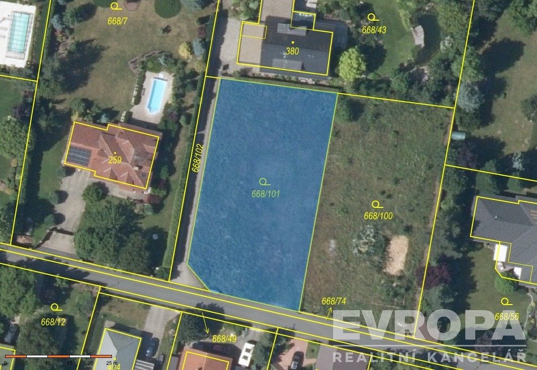 Fotografie 9/12 Prázdný pozemek s asfaltovou cestou, blízkostí zeleně a vzrostlými stromy, nacházející se v klidné oblasti vhodné pro výstavbu.