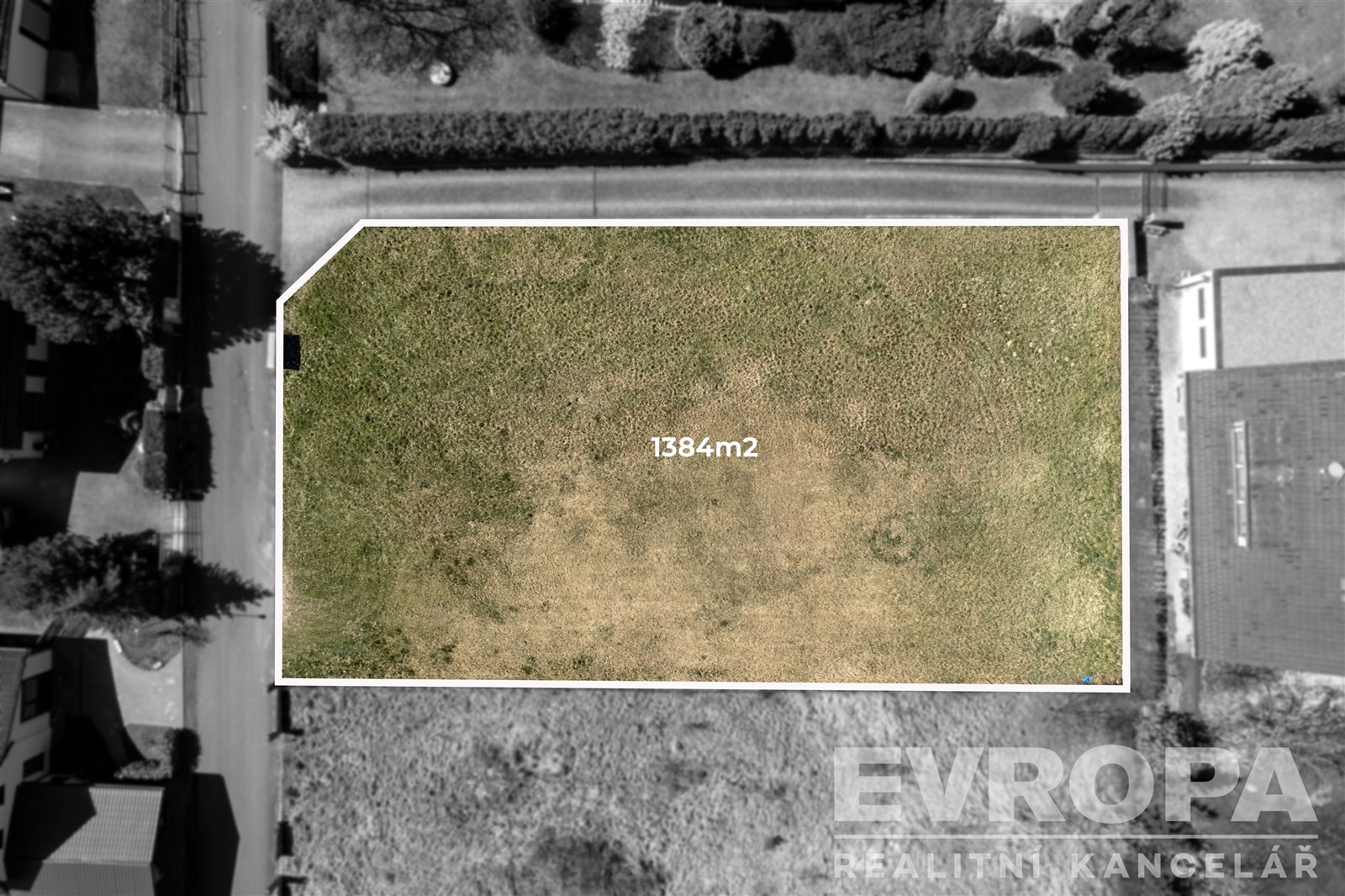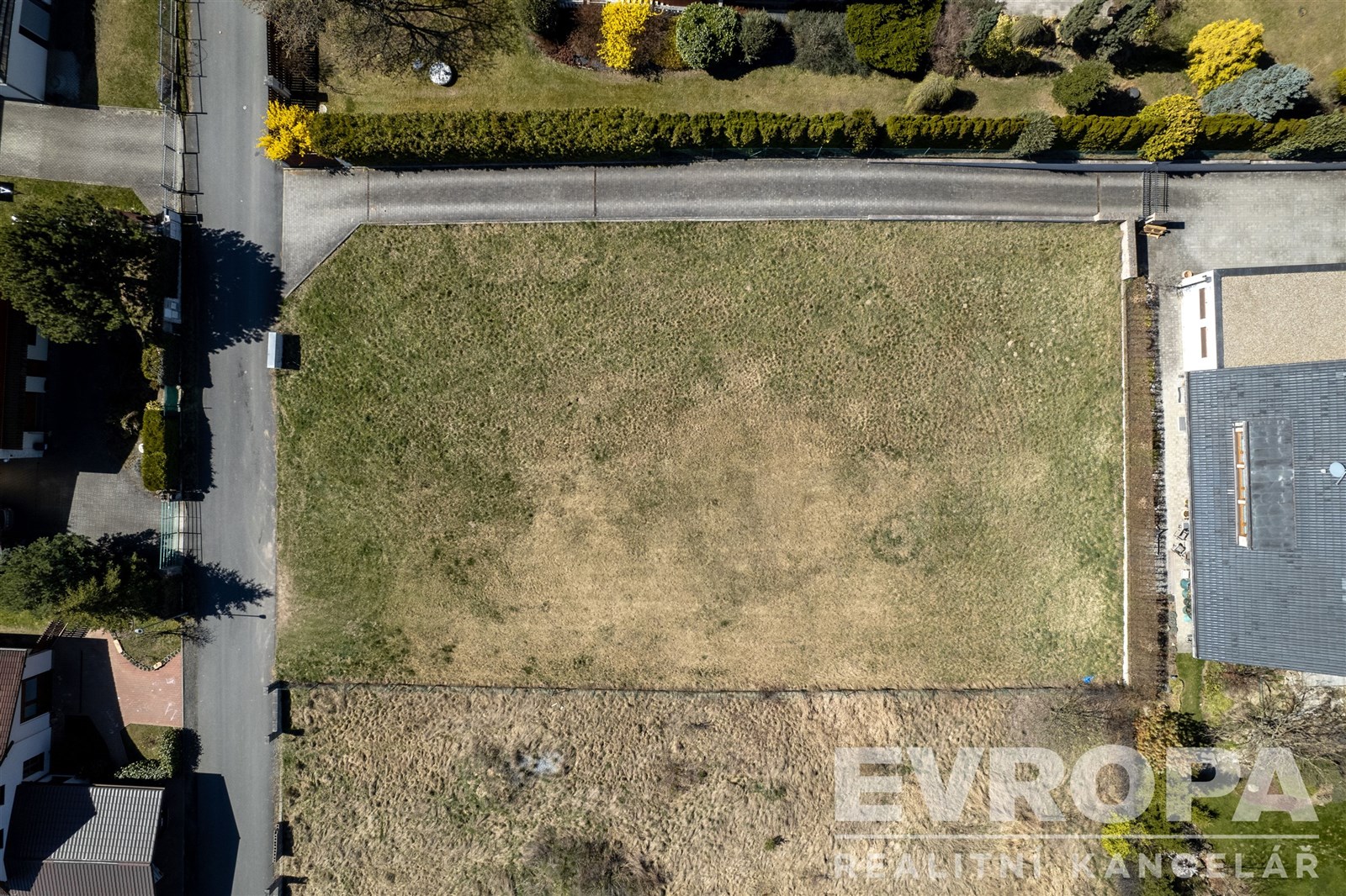 Fotografie 1/12 Prázdný pozemek na prodej s asfaltovou příjezdovou cestou, lemovaný živým plotem, ideální pro stavbu domu v klidné lokalitě.